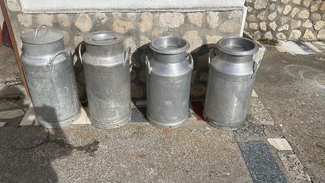 Detalles del productoConjunto de cuatro cántaros de leche metálicos, perfectos para decoración rústica o uso.