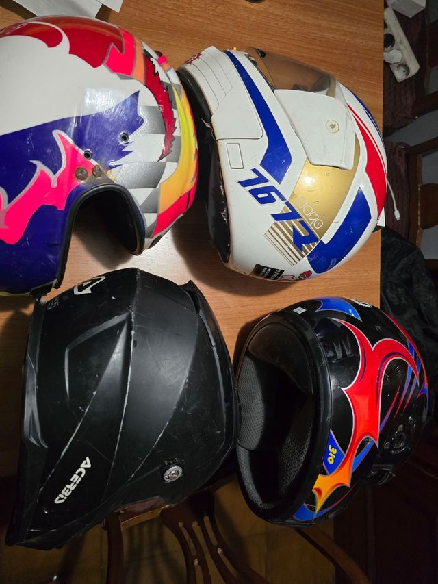 Detalles del productoConjunto de cuatro cascos de moto con diseños variados.