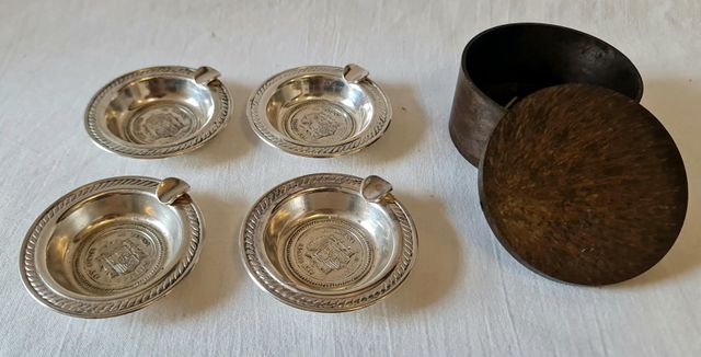 Detalles del productoConjunto de cuatro ceniceros portátiles de alpaca vintage con diseño inspirado en la antigua moneda de 5 pesetas.