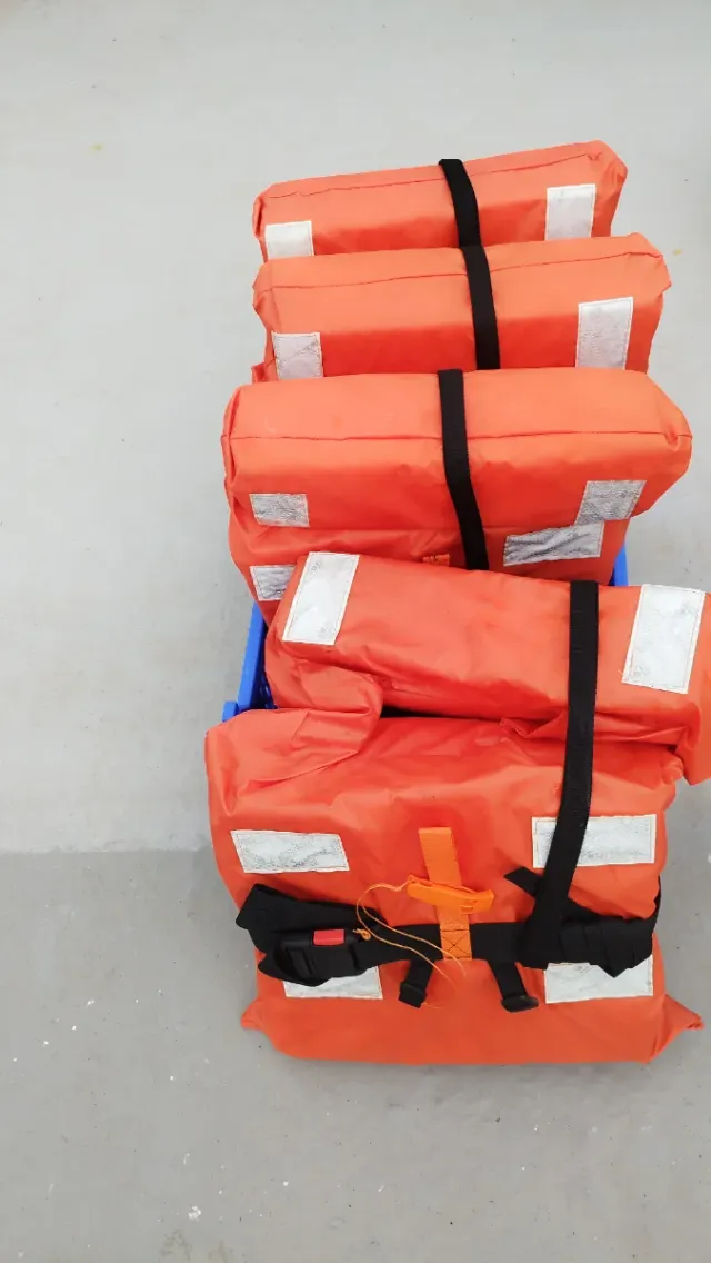 Lote de cuatro chalecos salvavidas homologados, listos para usar. - Color naranja brillante. - Cintas de sujeción negras. - Detalles reflectantes plateados.
