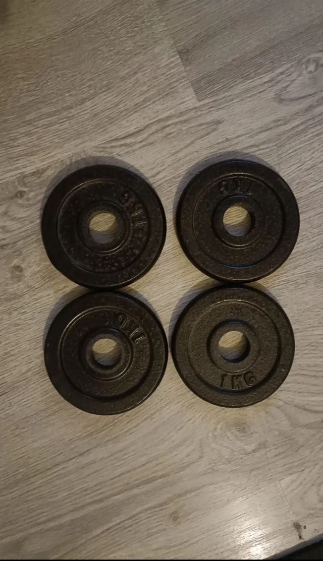 Lote de cuatro discos para mancuernas, cada uno con un peso de 1 kg. - Peso por disco: 1 kg. - Material: Hierro fundido.