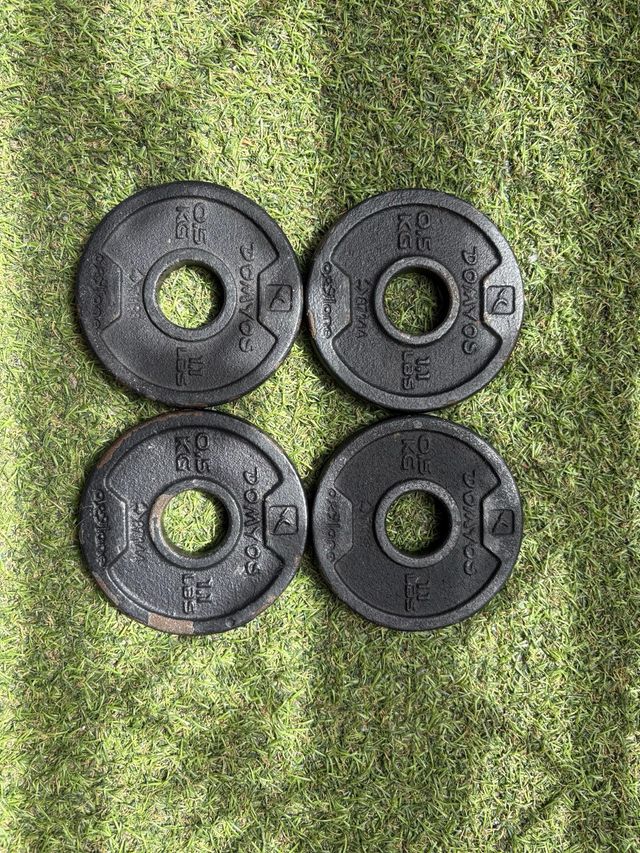 Se venden 4 discos de pesa de 0.5 kg cada uno. Ideales para complementar tu entrenamiento. - Peso: 0.5 kg por disco. - Material: Hierro fundido. - Marca: DOMYOS.
