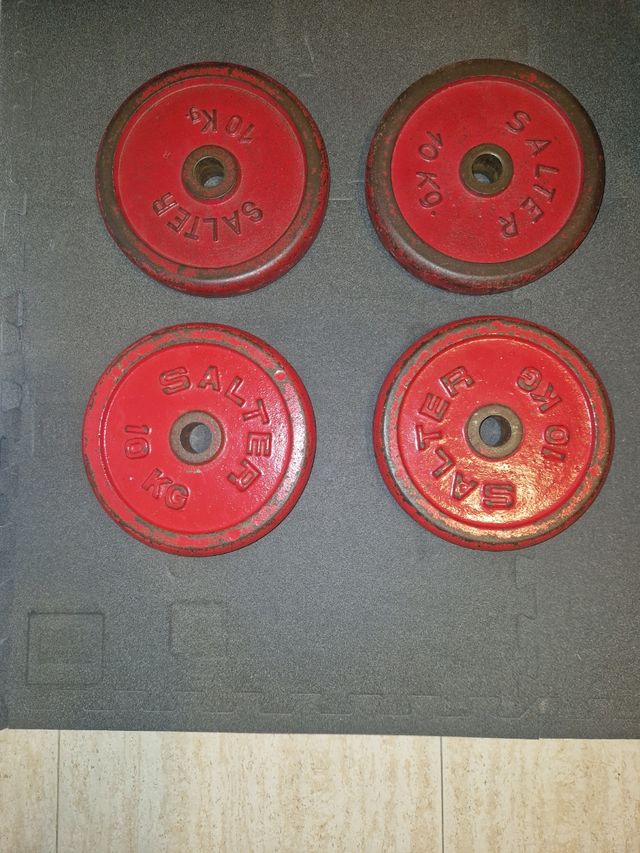Se venden 4 discos de pesa de la marca Salter, cada uno con un peso de 10 Kg. 30 mm.