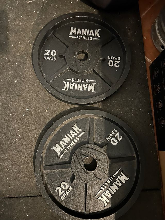 Detalles del productoSe venden 4 discos de peso para barra de 50mm olímpica de la marca Maniak Fitness. 2,5€ el kilo