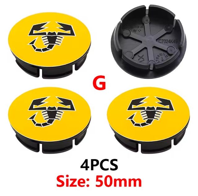 Detalles del productoSet de 4 emblemas para llantas de coche con el logo de Abarth. El diseño es un escorpión negro sobre fondo amarillo.