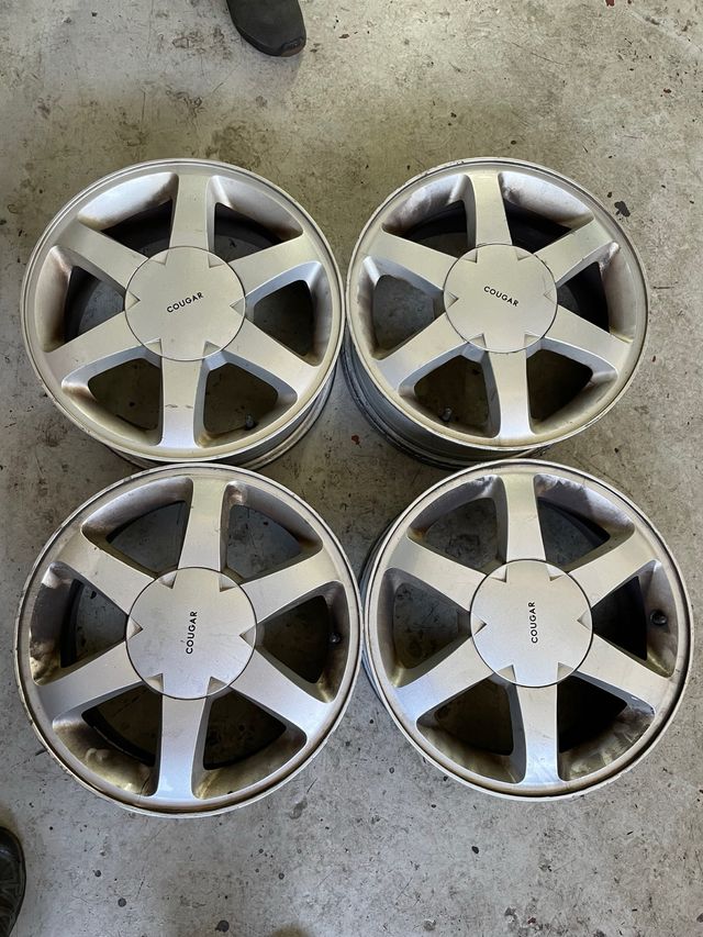 Se venden cuatro llantas de aluminio de Ford Cougar. Están en buen estado, aunque muestran señales normales de uso. - Modelo: Cougar - Cantidad: 4