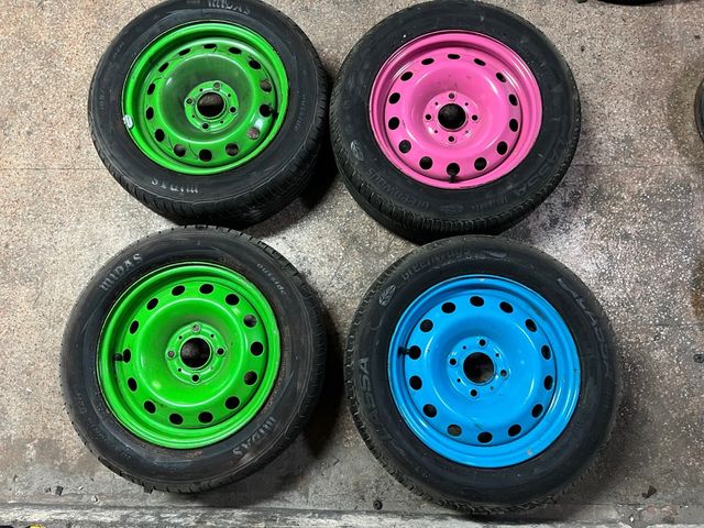 Detalles del productoJuego de cuatro llantas para PSA con neumáticos 185/60R14 82H. Las llantas están pintadas en colores llamativos. Se aprecian en buen estado. - Llantas de acero. - Neumáticos Midas y Lassa- Medidas: 185/60R14 82H.