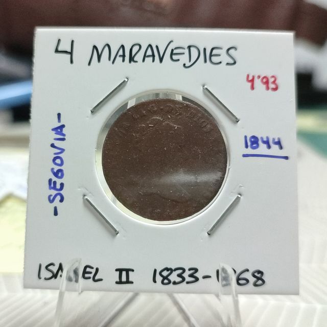 Detalles del productoMoneda de 4 Maravedíes de 1844, acuñada en Segovia durante el reinado de Isabel