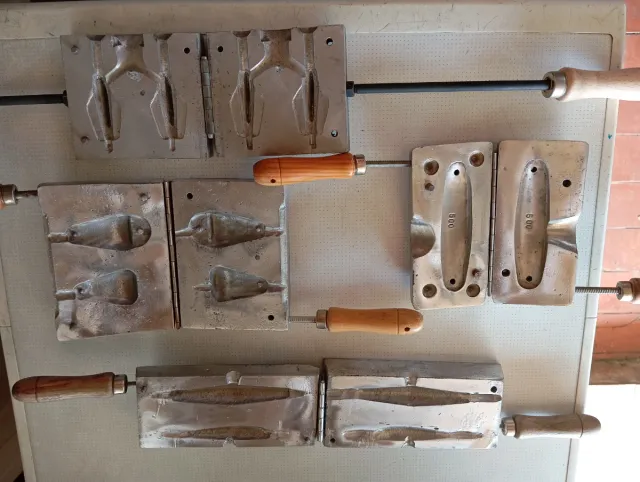 Detalles del productoConjunto de cuatro moldes de plomo para la fabricación de señuelos de pesca.