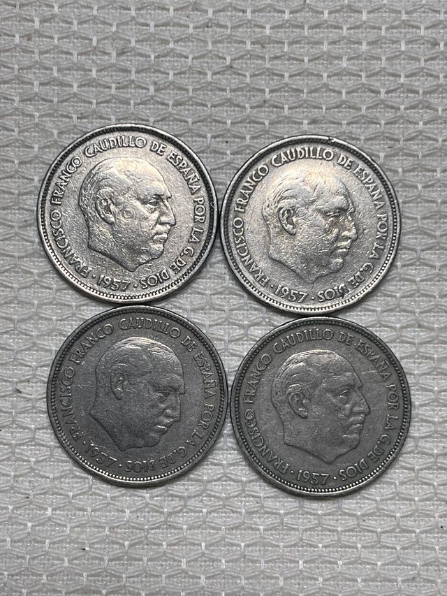 Detalles del productoLote de cuatro monedas de 25 pesetas españolas del año 1957. Presentan el busto de Francisco Franco.