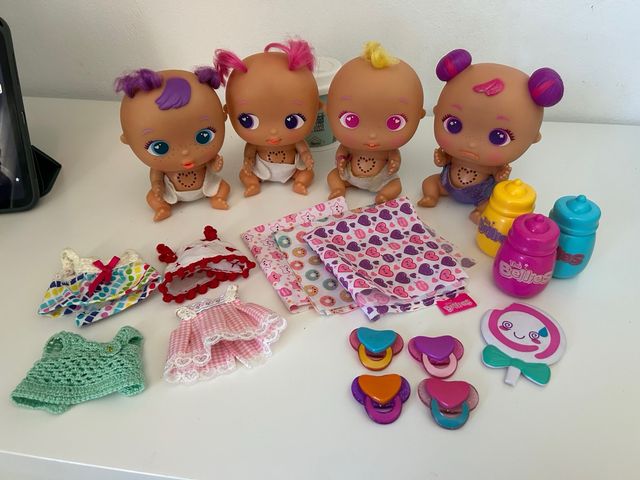 Detalles del productoVendo 4 muñecos Bellies (Muak-Muak, Yumi-Yummi, Pinky-Twink y Nonino) en perfecto estado, con pilas funcionando. Incluye chupetes, biberones, mantitas y 4 vestidos hechos a mano 💖. Todo limpio y listo para jugar. Ideal para regalar o coleccionar.