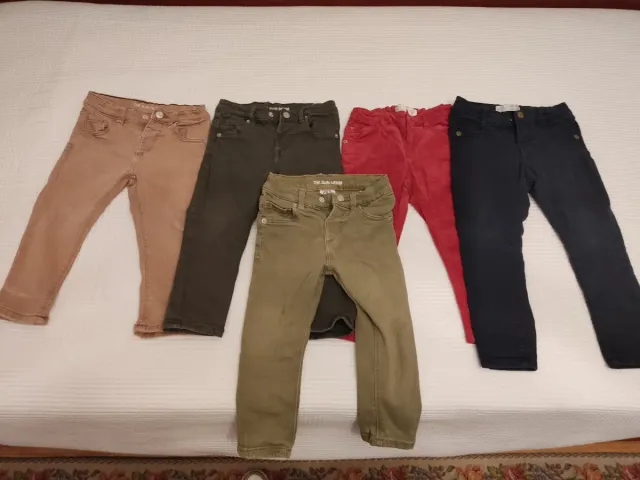 Lote de cuatro pantalones para bebé. - Pantalón verde botella oscuro. - Pantalón beige. Tiene una pequeña marca ver foto. - Pantalón azul marino. - Pantalón rojo de pana. - Pantalón verde oscuro