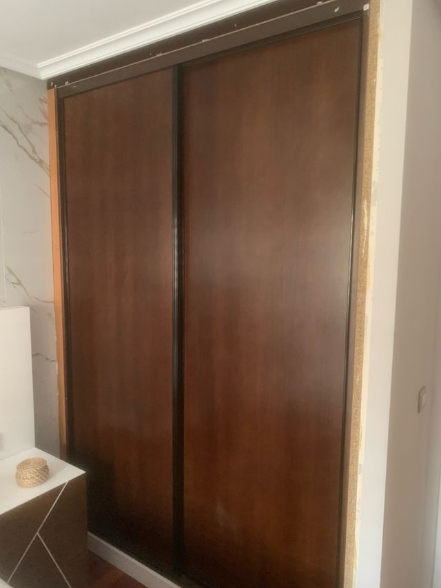 Detalles del productoConjunto de cuatro puertas correderas para armario, con un acabado en madera oscura. 2 puertas de 71x229cm y otras 2 de 79x229cm. puedo regalar las guiaderas y carrileras.