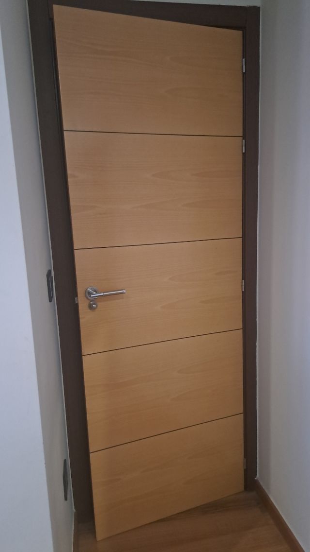 Detalles del productoConjunto de cuatro puertas de madera en color roble. Presentan un diseño moderno con finas rayas en contraste. Medidas: 72 cm x 200 cm.