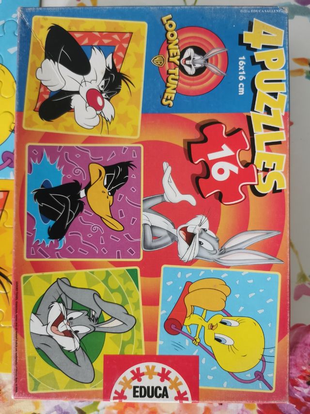 4 puzzle de 16 piezas cada uno. En el dorso se identifica cada uno por una figura geométrica. A uno de ellos le falta una pieza de un borde.