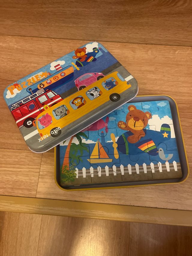 Detalles del productoJuego de 4 puzzles infantiles para niños. Cada puzzle tiene una temática diferente con animales y vehículos. Están en perfecto estado y vienen en una práctica caja metálica.