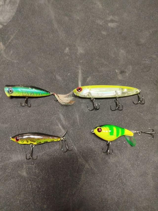 Detalles del productoLote de cuatro señuelos de pesca de superficie, ideales para la pesca deportiva.