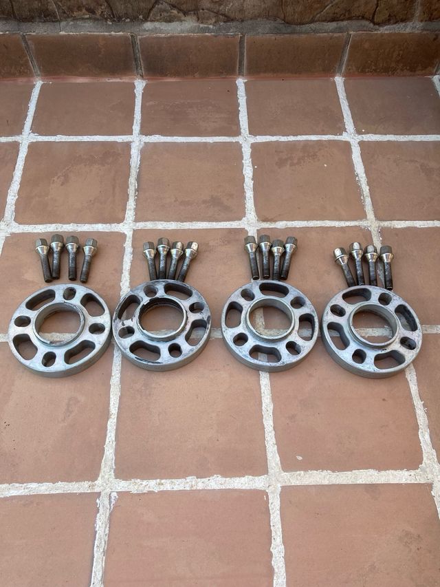 estaban puestos en un 206, validos para todo el grupo psa 4x108. a un separador le falta un trozo en la zona del buje como se puede ver en las fotos, pero se puede seguir usando ya que sigue apoyando la llanta y no vibra, los demás en perfecto estado.