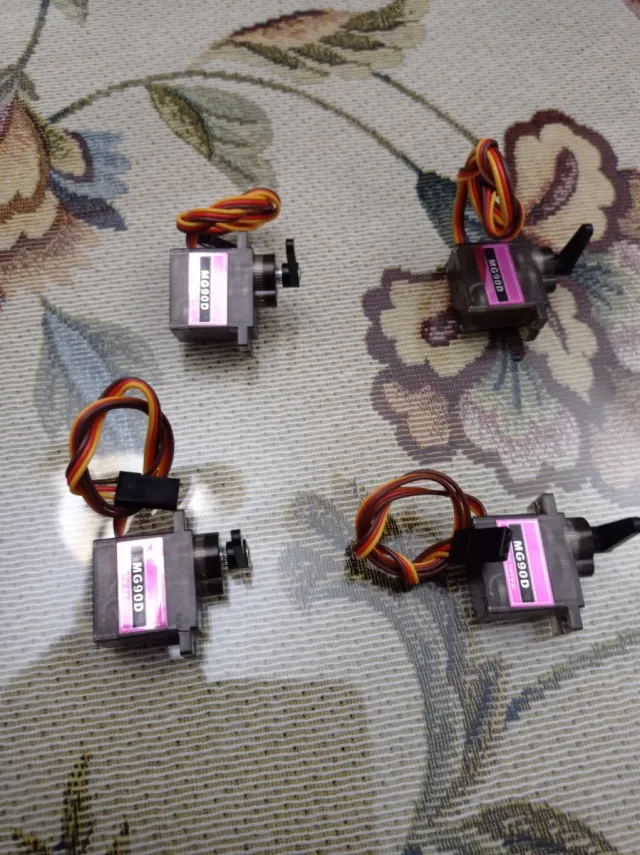 Lote de cuatro servomotores MG90D. - Servomotores compactos. - Cables de conexión incluidos. - Ideales para proyectos de robótica y modelismo.