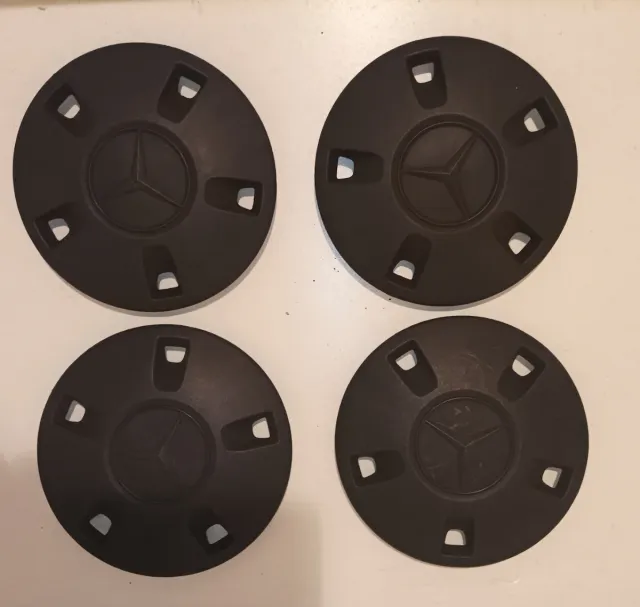 Juego de cuatro tapacubos para Mercedes Vito. Diseño en color negro con el emblema de la marca. - Cuatro tapacubos incluidos. - Logo de Mercedes-Benz en relieve.