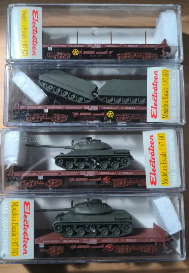 Lote de 4 vagones de carga militar de la marca Electrotren, escala 1:87 HO. - Ref.5161K x2 , 5162K y 5163K - Con sus cajas originales