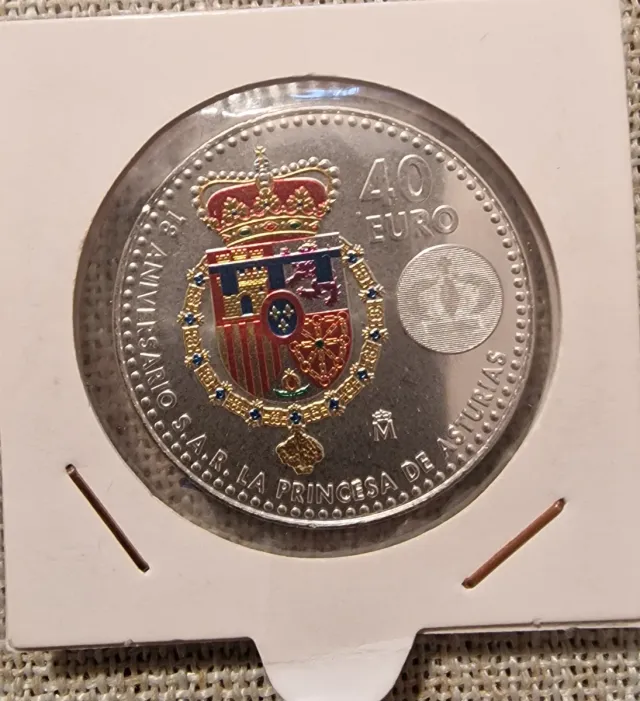 Moneda de plata de 40 euros conmemorativa del año 2023. - Diseño con el escudo de S.A.R. La Princesa de Asturias. - Canto con inscripción. - Acabado en plata.