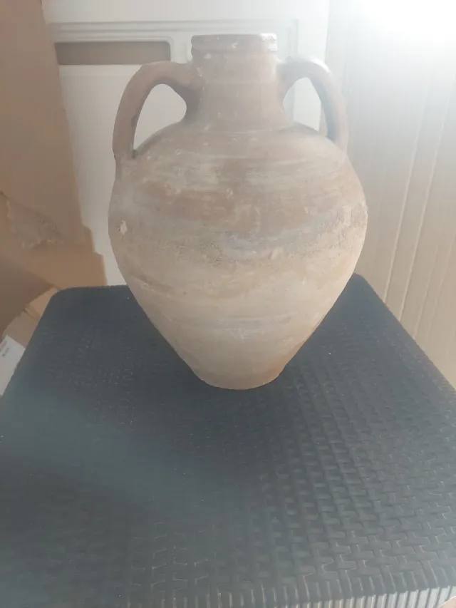Cántaro antiguo de barro con asas. - Material: Barro - Color: Tonalidades tierra - Diseño: Tradicional con dos asas