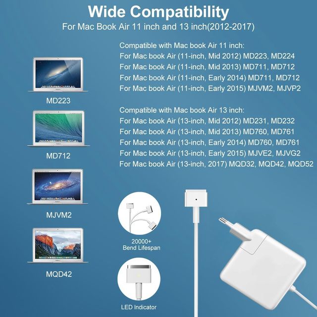 Adaptador de Corriente para Mac Book Air, Cargador Fuente de alimentación Compatible con Mac Air 11" 13" de Mediados de 2012 2013 2014 2015 2017, (A1436/ A1466/ A1465)