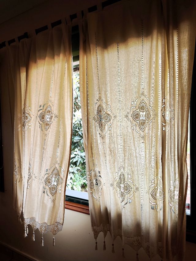 4Cortinas beige con bordado y calados de 140x175