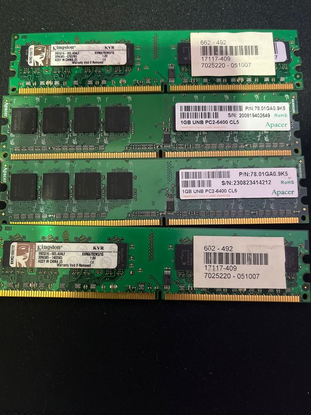 Módulos de memoria RAM DDR2 de 4GB. - Marca: Kingston - Modelo: KVR66700N5/16 - Capacidad: 4GB - Tipo: DDR2 - Velocidad: PC2-6400 CL5 - Voltaje: 1.8V