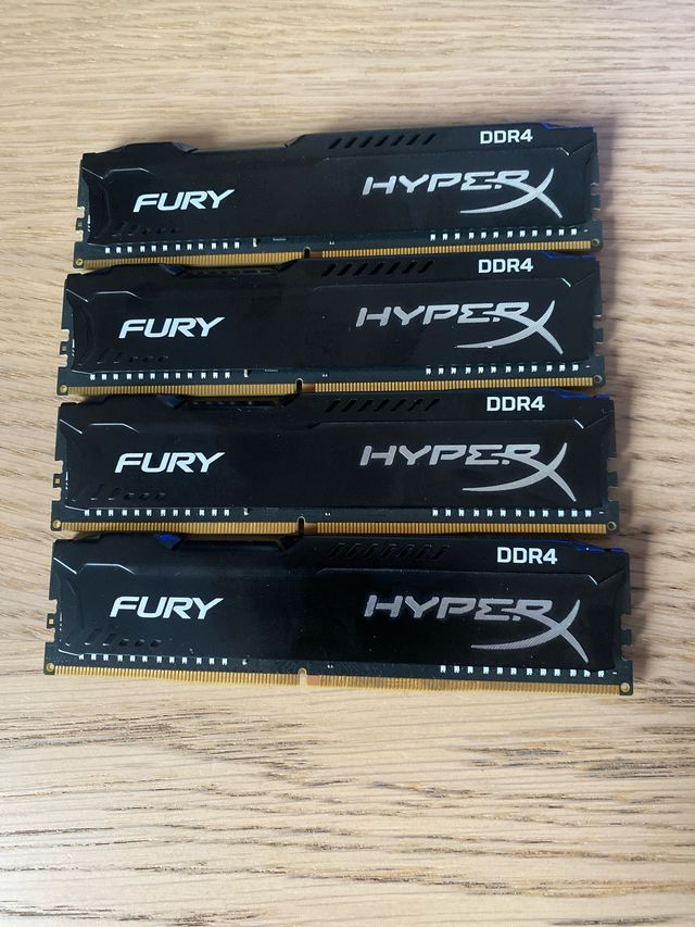Conjunto de cuatro módulos de memoria RAM DDR4. - Capacidad total de 32 GB (4 x 8 GB). - Diseño en color negro con detalles plateados. - Compatibles con DDR4.