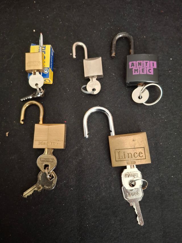 Detalles del productoLote de cinco candados variados, cada uno con su llave.