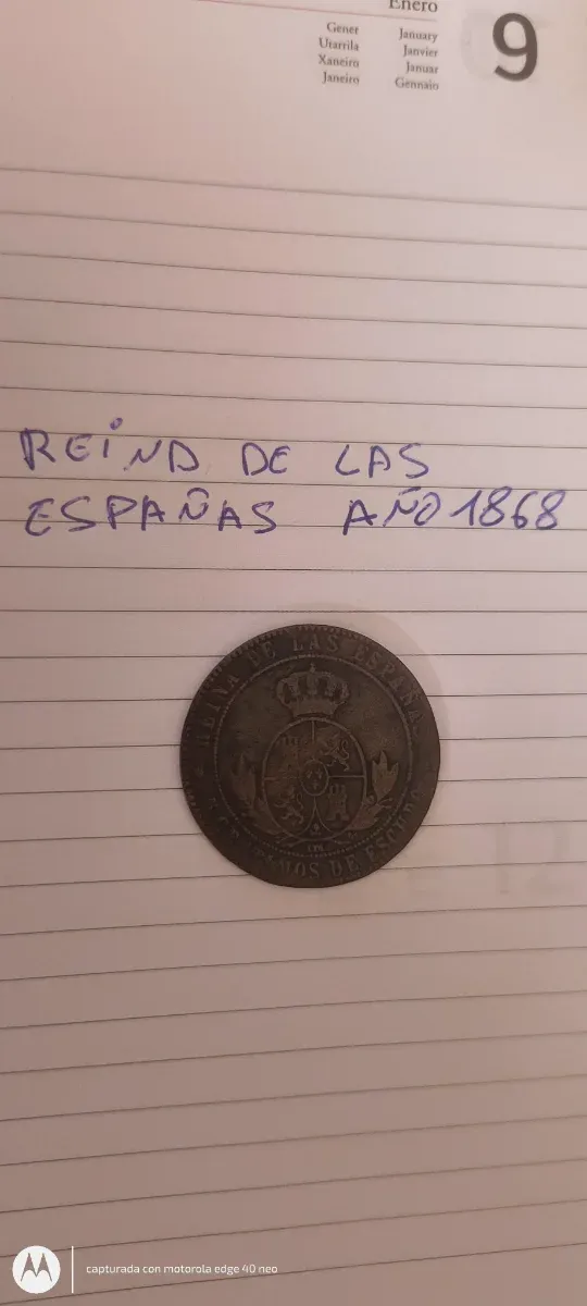 Moneda de 5 céntimos de escudo del año 1868. - Canto: Estriado. - Leyenda: REINA DE LAS ESPAÑAS AÑO 1868.