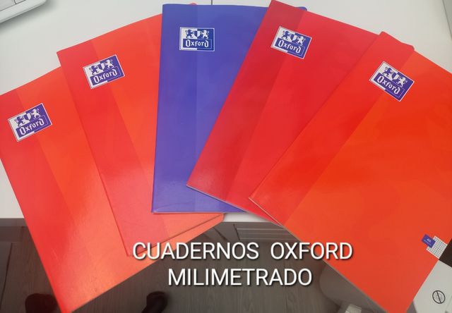 Detalles del productoCuadernos Oxford de milimetrado, ideales para tomar apuntes o dibujar. Son cinco cuadernos en total, cuatro de color rojo y uno morados. Listos para usar.