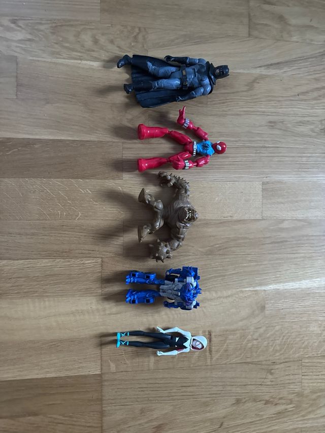 - Incluye Batman, Spiderman, Spider-Gwen, Sandman y dos figuras más.