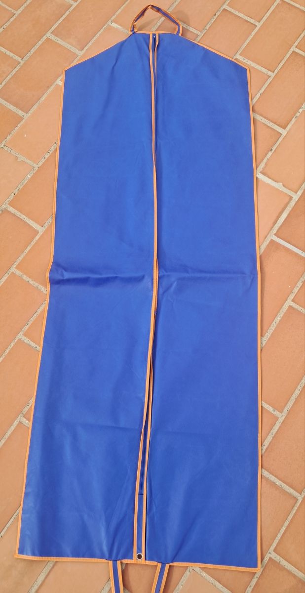 Detalles del productoVendo cinco fundas para trajes. Son de color azul marino con ribetes anaranjados. Ideales para guardar y transportar ropa.