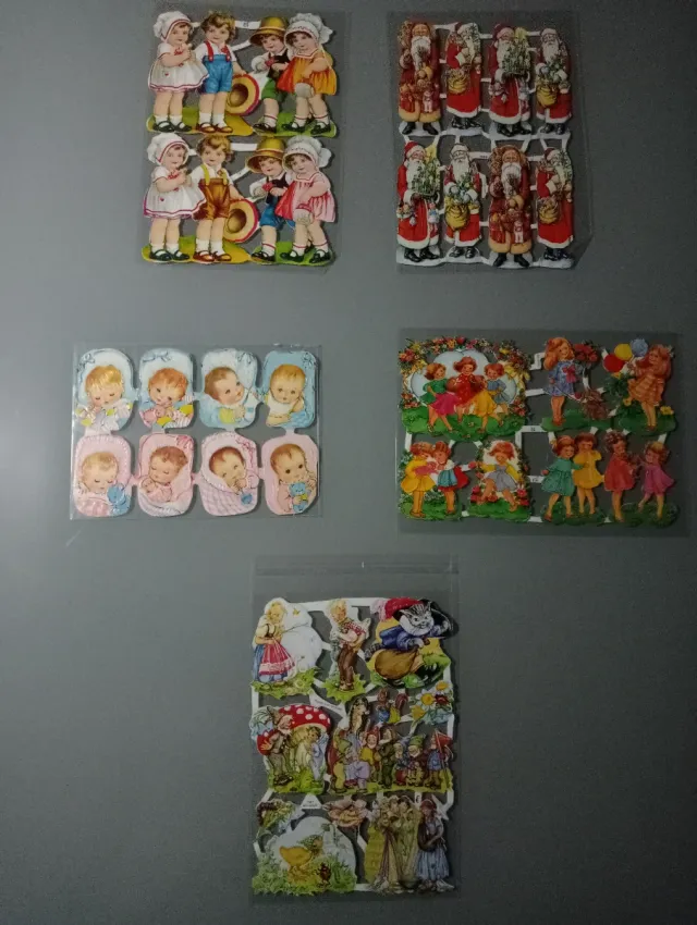 Detalles del productoConjunto de 5 láminas de cromos de picar, originales de Alemania. Estas láminas vintage presentan diseños infantiles y escenas temáticas.