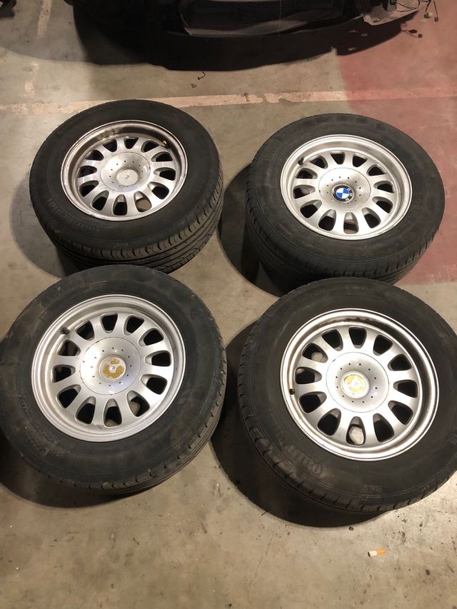 Juego de 5 llantas de BMW de 15. de aluminio. con 2 neumaticos usables y 2 para cambiar. aunque en la foto salen 4 son 5.