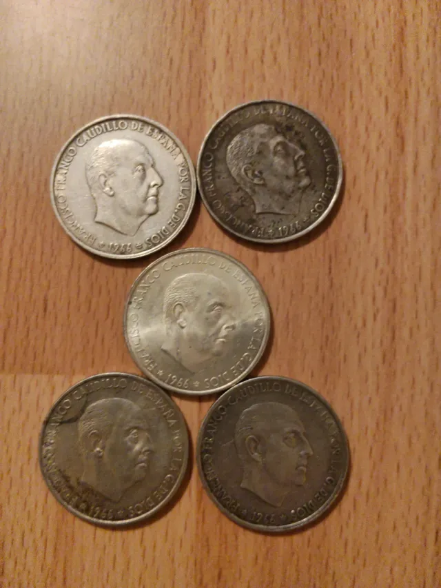 Detalles del productoConjunto de cinco monedas de 100 pesetas de España, con la efigie de Francisco Franco.