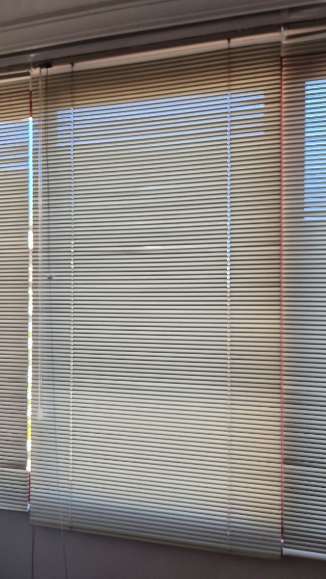 Conjunto de cinco persianas de lamas de aluminio de color beige. - 4 de 78x145. - 1 de 100x135. No se venden separadas. Se vende todo el conjunto.