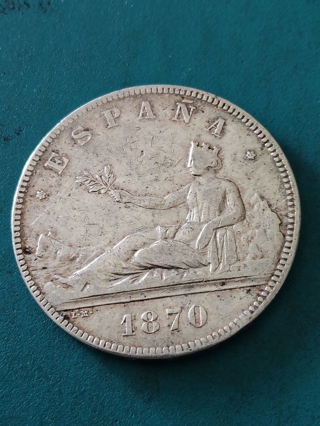 Detalles del productoMoneda de 5 pesetas de España del año 1870. Presenta un diseño detallado con la figura de una mujer sentada y la inscripción ESPAÑA.