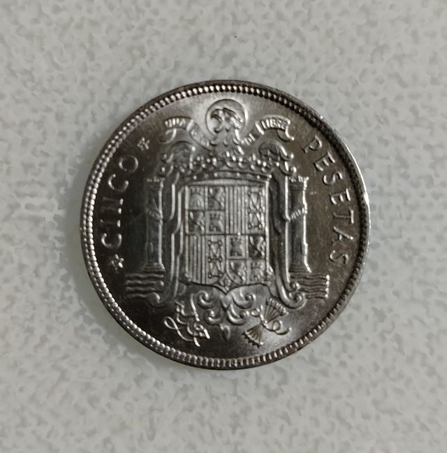 Moneda de 5 pesetas de España, acuñada en 1949*50. Muy bonita. - Diseño con escudo. - Canto con inscripción.