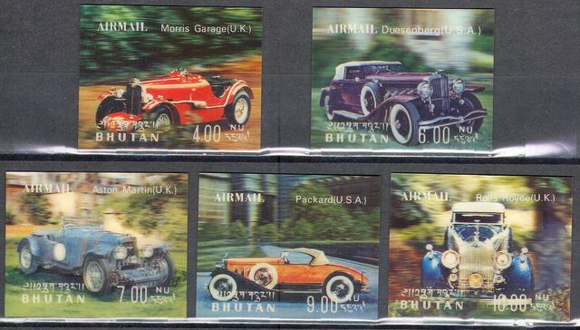 Detalles del productoLote de 5 sellos conmemorativos en 3D (efecto lenticular) | Buthan (Bután), 1971 | Nuevos, sin señal de fijasellos (MNH) | Serie: automóviles / coches | Temas: Morris Garage, Duesenberg, Aston Martin, Packard y Rolls Royce | Nº catálogos » Yvert et Tellier BT PA 88/92 ; Michel BT 455/59 | Valores faciales: 4, 6, 7, 9 y 10 Ngultrum butanés | Precio según catálogo Michel: 14 € | Medidas: 50 x 40 mm | Somos filatelia.
