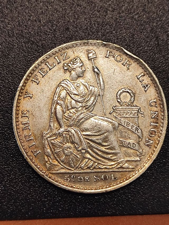 Detalles del productoUn Quinto de Sol. Moneda peruana , año 1899. Plata. Presenta un pequeño golpe en canto superior. Por lo demás está preciosa con un color de pátina muy bonito. Monedas muy buscadas por su hermoso diseño y acuñación.