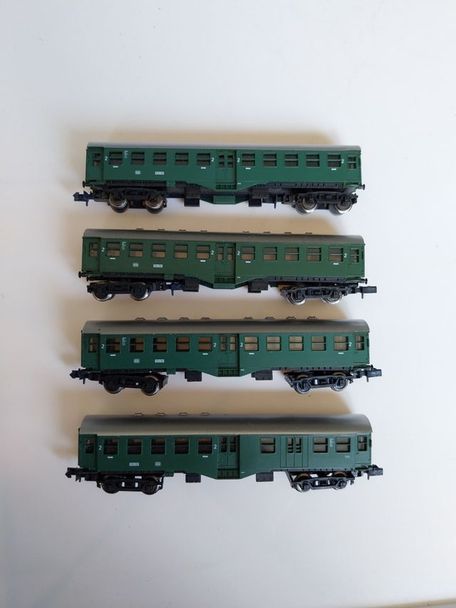 Detalles del productoSe venden cuatro vagones de tren de la marca Arnold, escala N, de los ferrocarriles alemanes (DB). Buen estado con todos sus topes y enganches