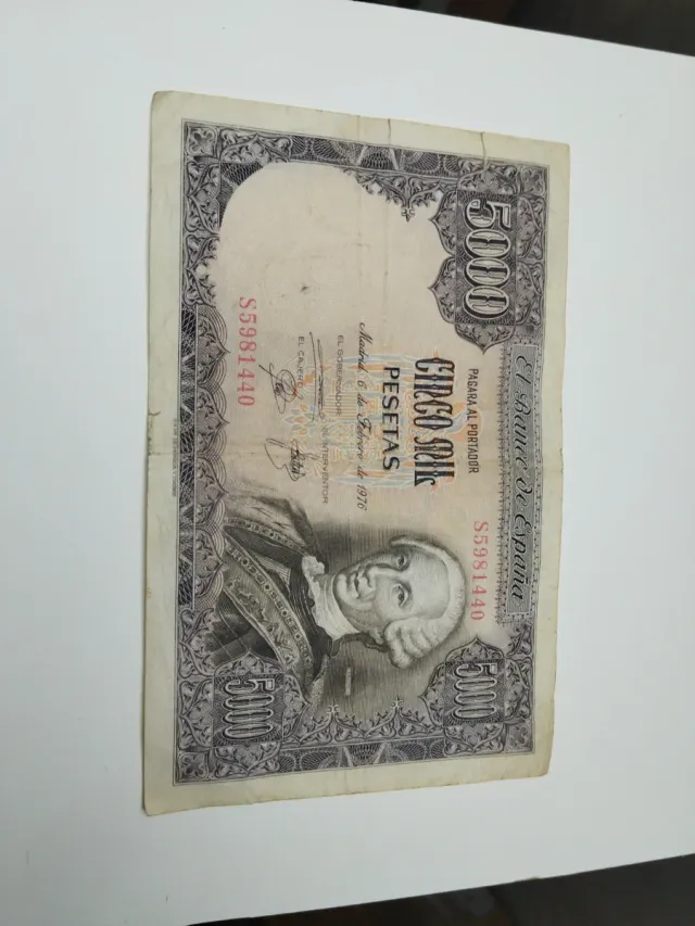 Detalles del productoBillete de 5000 pesetas del Banco de España, emitido en 1976.
