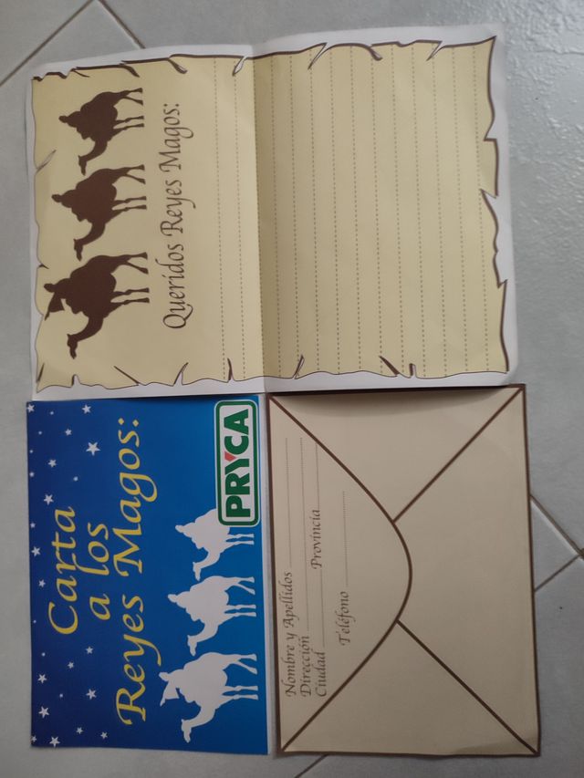 Lote de 6 cartas para los Reyes Magos de la marca Pryca. - Diseño temático con Reyes Magos y estrellas. - Espacio para escribir nombre, dirección y ciudad.