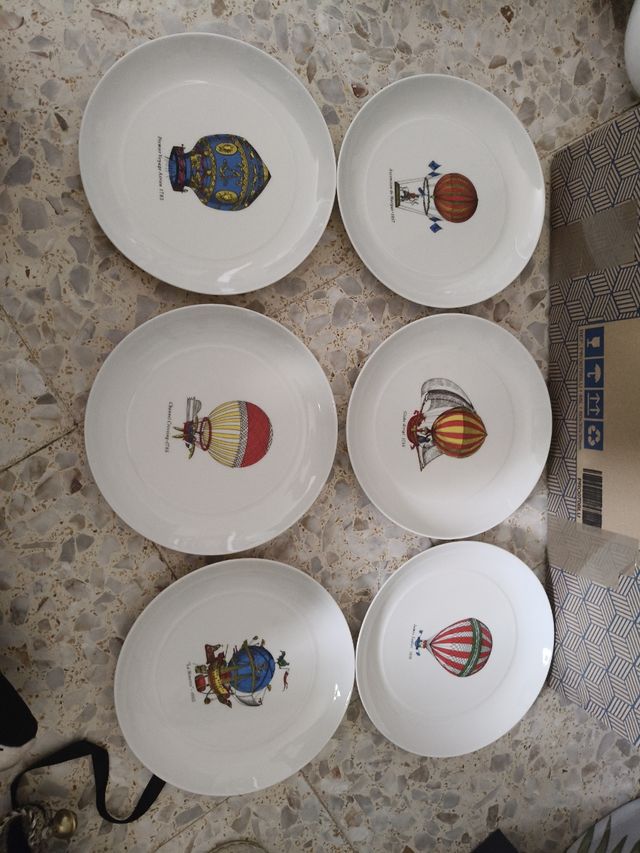 Detalles del productoPreciosos platos decorativos de porcelana con ilustraciones de globos aerostáticos de diferentes épocas. Son seis platos en total, con imágenes únicas y detalladas. Están en perfecto estado, listos para decorar tu mesa o añadir un toque vintage a tu hogar. - Seis platos de porcelana. - Diseño con globos aerostáticos. - Motivos históricos. - Perfecto estado.