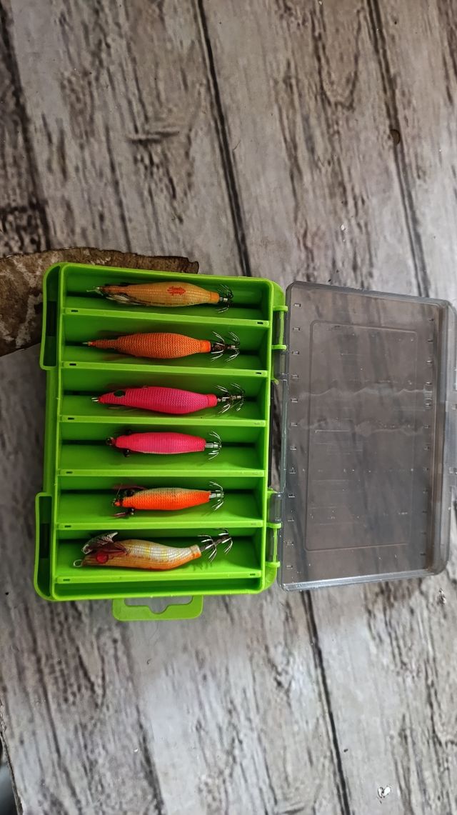 Detalles del productoSe venden ocho señuelos de calamar en una práctica caja verde. Son ideales para la pesca.