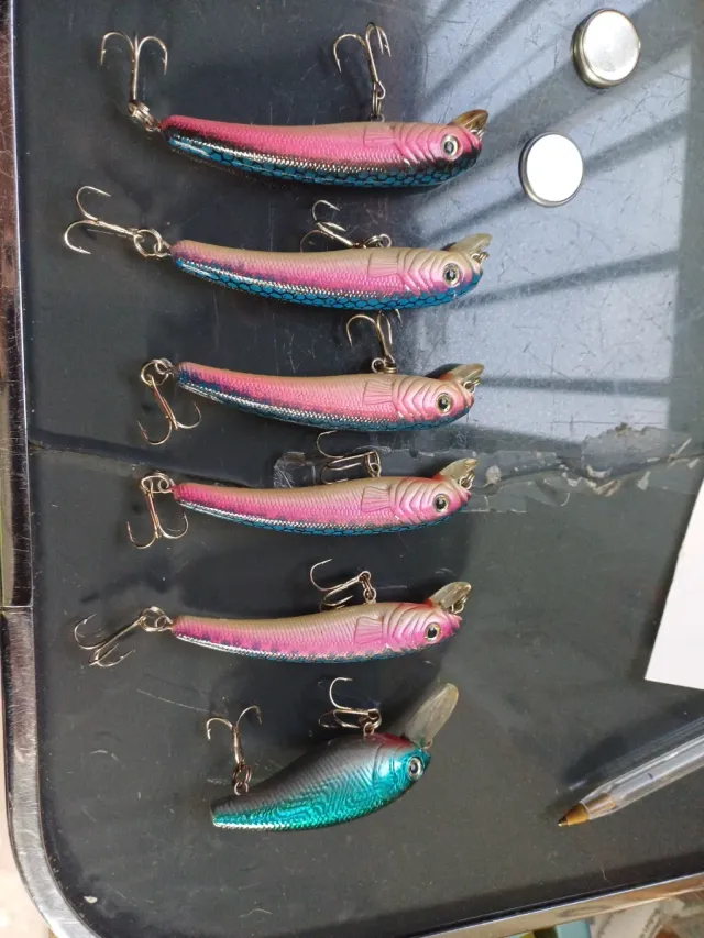 Conjunto de seis señuelos de pescar - Diseño realista en forma de pez. - Colores variados, incluyendo rosa, azul y plateado. - Equipados con anzuelos triples.